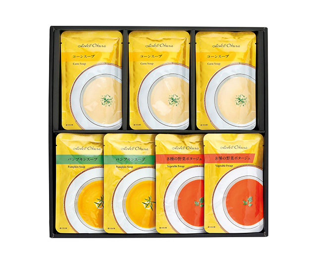 - コーンスープ×3、パンプキンスープ・8種の野菜ポタージュ×各2、各120g