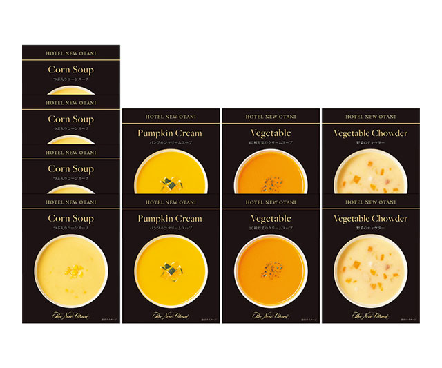 - つぶ入りコーンスープ×4、パンプキンクリームスープ・10種野菜のクリームスープ・野菜のチャウダー×各2、各150g