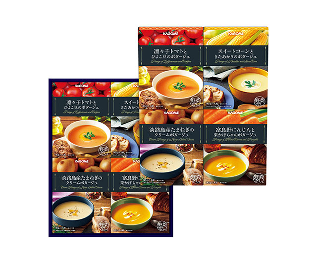 - 凛々子トマトとひよこ豆のポタージュ・スイートコーンときたあかりのポタージュ・淡路島産たまねぎのクリームポタージュ・富良野にんじんと栗かぼちゃのポタージュ各140g×各2