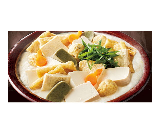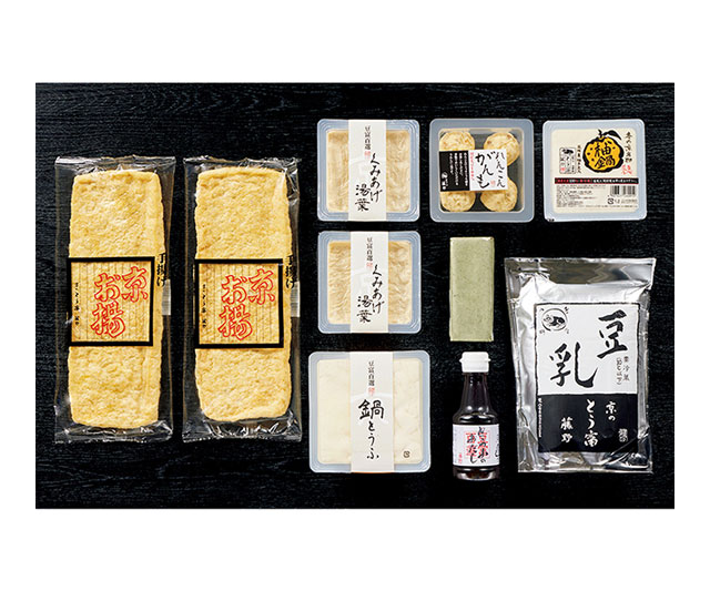 豆乳1s・豆富百選鍋とうふ380g・柚子皮入り鍋とうふ300g・れんこんがんも5個入・よもぎ麩1本入・とうふのおだし150ml×各1、豆富百選くみあげ湯葉80g・京揚げ1枚×各2(3〜4人前)