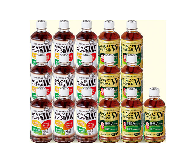 - からだすこやか茶W+(特定保健用食品)×9、からだおだやか茶W(機能性表示食品/届出番号:F258)×7、各350ml