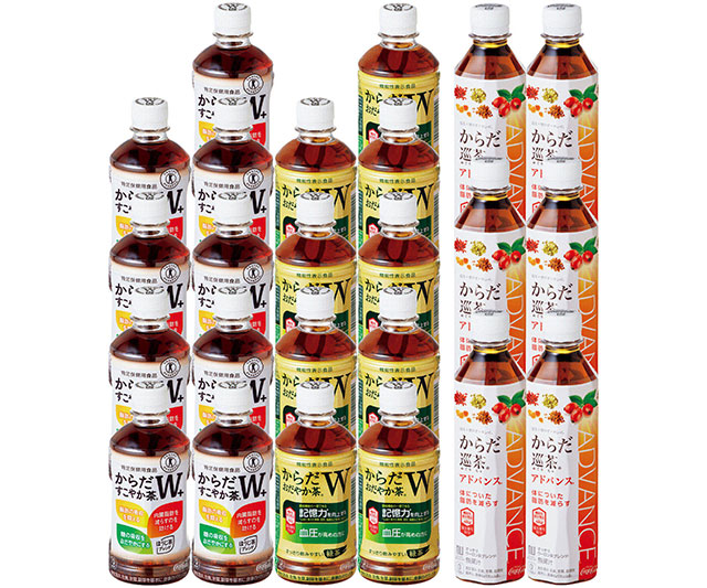 - からだすこやか茶W+(特定保健用食品)・からだおだやか茶W(機能性表示食品/届出番号:F258)各350ml×各9、からだ巡茶アドバンス(機能性表示食品/届出番号:B19)410ml×6