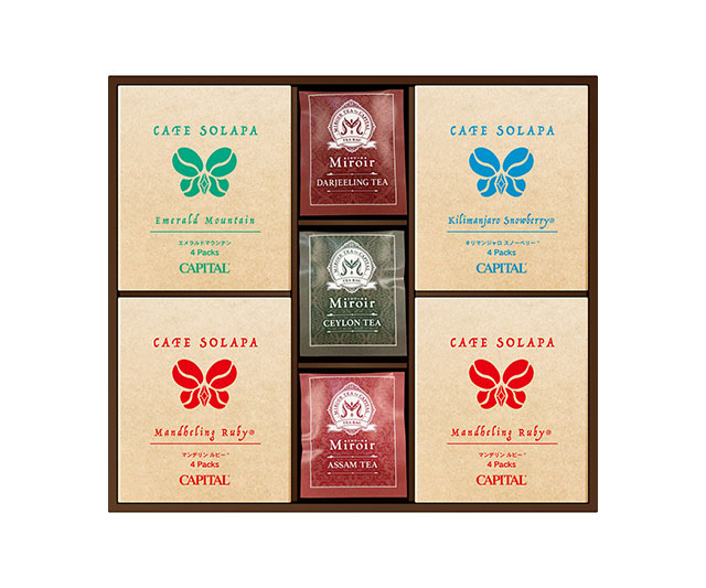 - マンデリンルビー×2、エメラルドマウンテン・キリマンジャロスノーベリー×各1、各10g×各4/日本製、ダージリン・アッサム・セイロン×各4/日本製(茶葉:インド・スリランカ)