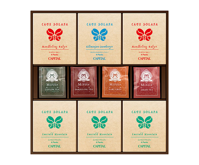 - エメラルドマウンテン×3、マンデリンルビー×2、キリマンジャロスノーベリー×1、各10g×各4/日本製、ダージリン・アッサム・セイロン・アールグレイ×各4/日本製(茶葉:インド・スリランカ)