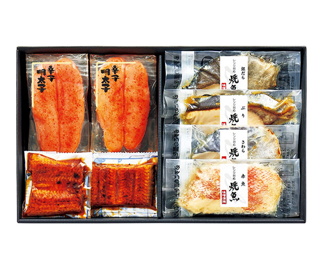 無着色辛子明太子70g・国産鰻蒲焼(たれ・山椒付)40g×各2、銀だら味噌漬焼・ぶり味噌漬焼・さわら粕漬焼・赤魚味噌漬焼各50g×各1