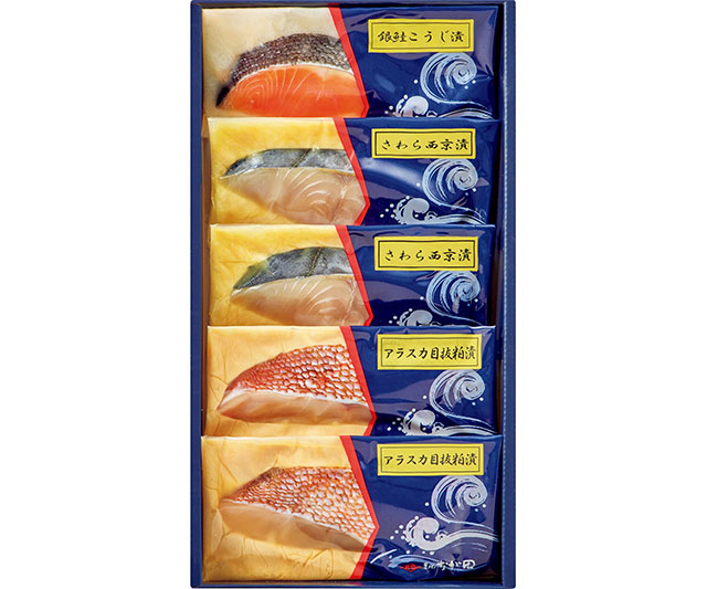 - さわら西京漬・アラスカ目抜粕漬×各2、銀鮭こうじ漬×1