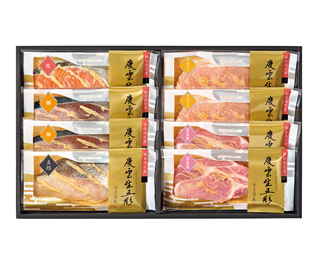 魚の西京漬(ぶり×2、鮭・真だら×各1)、肉の西京漬(大山どり・豚ロース肉×各2)、電子レンジ対応シート付(8枚)