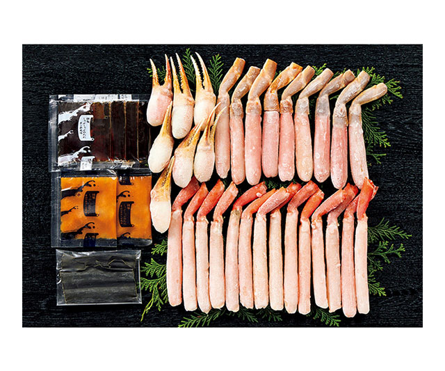 - 紅ずわいがに棒肉剥き身(北海道産)240g・生ずわいがに棒肉剥き身(カナダ産)200g・生ずわいがに2本爪剥き身(カナダまたは北海道産)160g・だし昆布5g×各1、ポン酢風味たれ30g×4、辛口マヨネーズ風味たれ30g×2