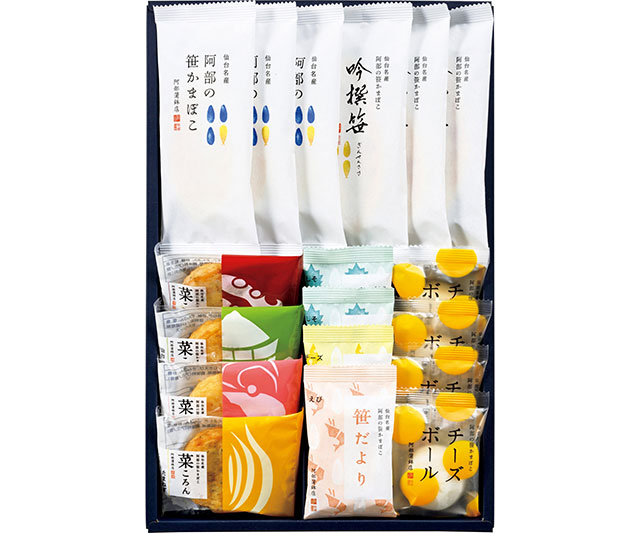 阿部の笹かまぼこ・吟撰笹×各3、笹だより・チーズボール・菜ころん×各4