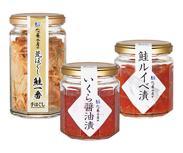 荒ほぐし鮭一番170g、いくら醤油漬・鮭ルイベ漬各140g