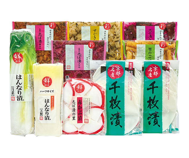 - はんなり漬(大根1/4本・白菜150g×各1)、千枚漬80g×2、赤かぶ漬72g×1、志ば漬・すぐききざみ・志そ漬きゅうり・里のごぼう・志ば漬醤油味各40g×各1