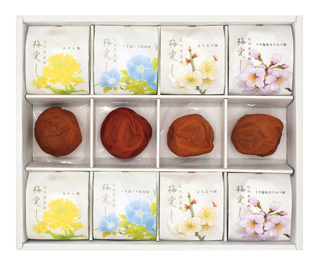 みかん梅(塩分約5%)・しそ漬うす塩味梅(塩分約8%)・はちみつ梅(塩分約8%)・うす塩味はちみつ梅(塩分約3%)×各3
