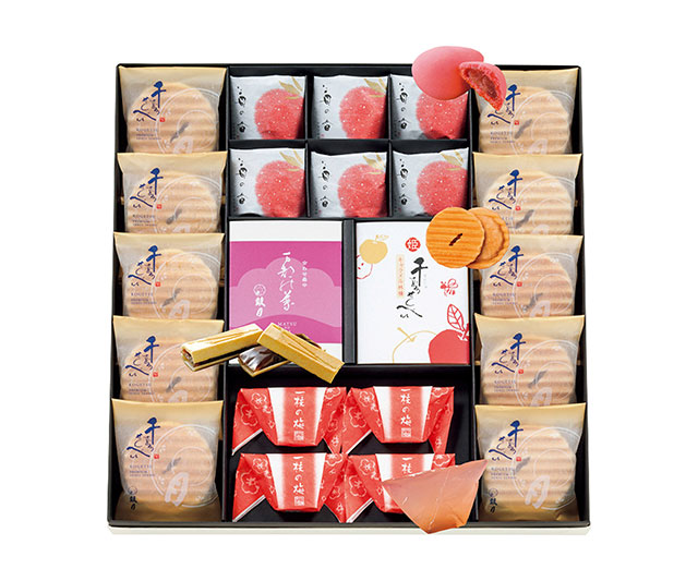 - プレミアム千寿せんべい×10、万都の葉×2、姫千寿せんべいキャラメル林檎4枚入×1、一枝の梅×4、苺の香×6