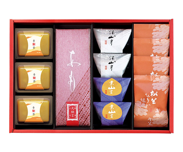 丁寧に炊きあげた大粒の小豆と羽二重餅との絶妙な調和が特徴の代表銘菓「あも」をはじめ、季節の素材を使った創作和菓子を詰め合わせました。幅広い世代の方に喜んでいただけるギフトです。