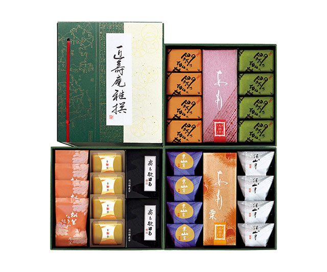 - あも・あも(栗)×各1、あも歌留多(最中種)×2、閼伽井(黒蜜きなこ)・閼伽井(抹茶)・栗山家・深山守・松笠ひろい・季折×各4