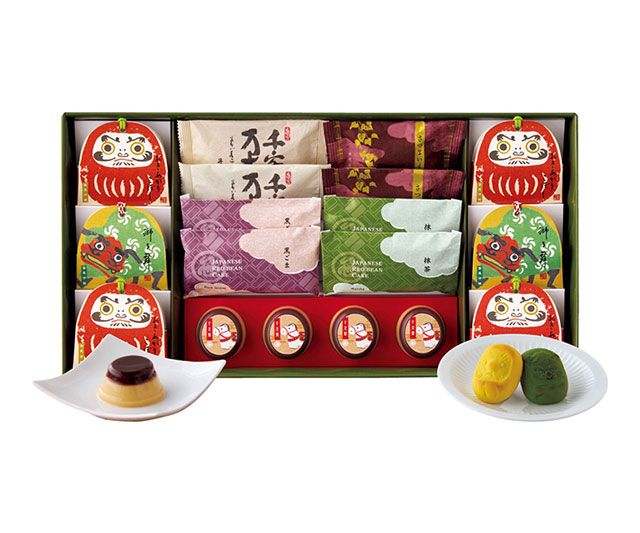 - 干支菓(午)・おきあがりこぼし×各4、獅子舞・千客万来・さつまいも×各2、JAPANESE RED BEAN CAKE(黒ごま・抹茶×各2)