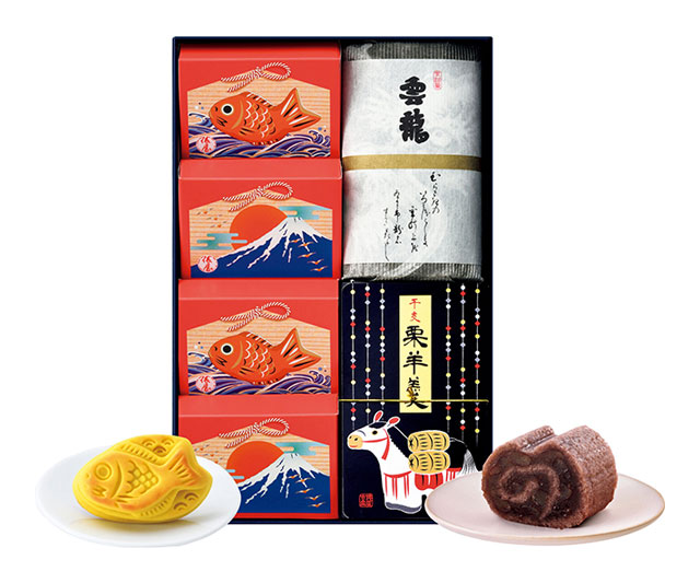 宝暦5年(1755年)創業の京菓子の老舗〈俵屋吉富〉。味わい豊かな銘菓「雲龍」や、鯛の姿が愛らしい、ふっくらとした桃山製生地で白こし餡を包んだ「京禧鯛焼」、味わい深い「栗羊羹」などを詰め合わせました。