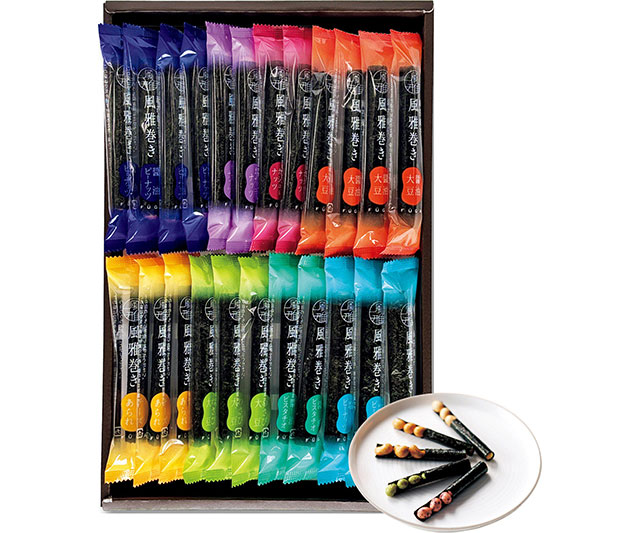 香り、色つや、味と三拍子揃った有明海産の若摘み焼海苔を使用した海苔菓子の詰合せ。大豆やピーナッツなどの豆素材を一本一本丁寧にスティック状の手巻きにしました。おやつはもちろん、お酒のおつまみにもおすすめです。