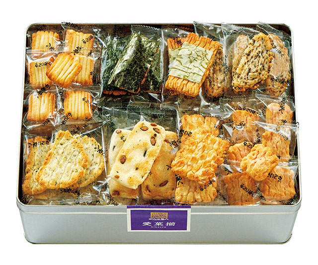 - おかき(ごまもち白、黒豆もち、寿巻、磯の雪、風神、汐半月、岩しぐれ、海老しぐれ)計655g