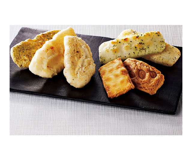 - 富山湾白えび・磯の香り青のり・富山湾ほたるいか・加賀能登甘えび×各3、バージンオリーブオイル・スイートバジル・サワークリームオニオン・アーモンドミモレット×各4、スモークチーズ・沖縄黒糖アーモンド×各6