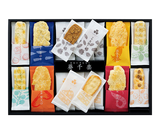 白えびやほたるいかなどの海鮮素材とスイートバジルなどの洋風素材を使った個性豊かなおかき詰合せ。ソフトな口あたりで、幅広い年代に親しまれています。