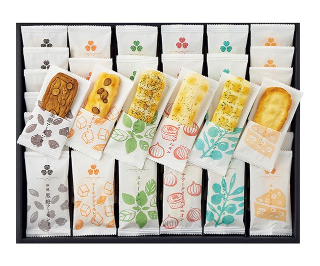 - バージンオリーブオイル・スイートバジル・サワークリームオニオン・アーモンドミモレット×各6、沖縄黒糖アーモンド・スモークチーズ×各8