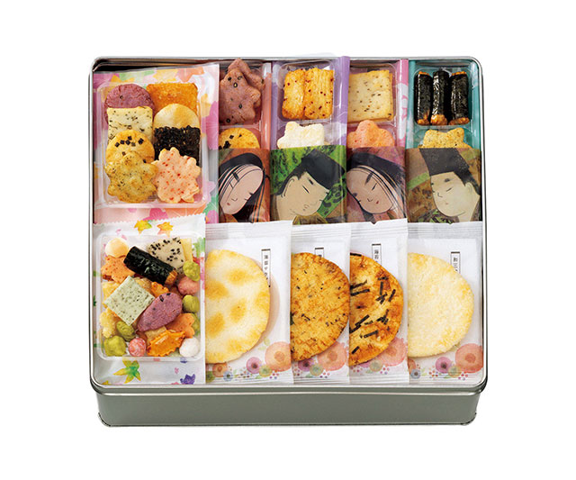 さくら紅葉・花うららけし×各3袋、源氏歌あわせ×8袋、月まどか(海苔とだし醤油・揚げ煎餅・青磯の香り・和三盆蜜がけ・海老サラダ・藻塩サラダ×各5)