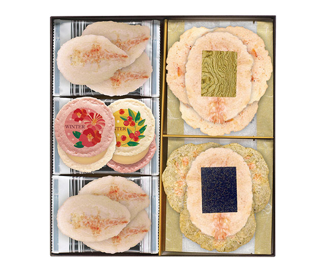 - 小えび姿焼×6袋、桜えびよせ焼・小えびよせ焼・紅白せんべいチーズサンド×各3袋、海老姿焼こんぶ・海老姿焼のり×各1袋