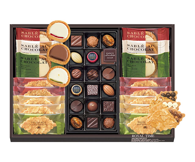 とろけるソースを閉じ込めたチョコレートサブレ「サブレオショコラ」、香ばしい木の葉形クッキー「ファヤージュ」など、バラエティー豊かな詰合せです。