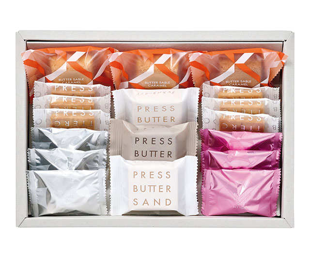人気のバターサンドとサクサクとした食感が魅力のプレスバタークッキー、上品な甘さのブールドネージュなどを詰め合わせました。さまざまな味わいを一度に楽しめる、贈り物にぴったりのギフトセットです。
