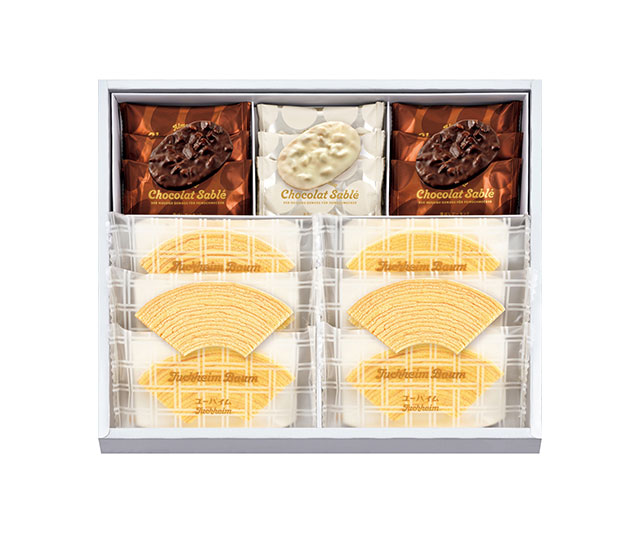 しっとり香り豊かに焼きあげたバウムクーヘンと、濃厚な味わいのショコラサブレの詰合せ。素材の美味しさを大切にしてつくりあげた銘菓をお楽しみください。
