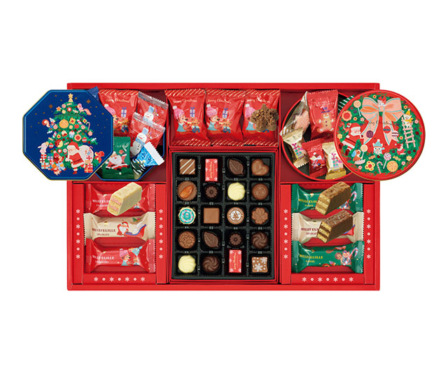 - クリスマスファンシーチョコレート×20、ミルフィーユ×6、チョコレート33g(缶入)、チョコレート菓子・マシュマロ・クッキー計8個(缶入)、星型クランチ×3
