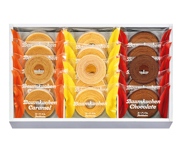 日本で初めてバウムクーヘンを焼いた〈ユーハイム〉。伝統製法にこだわり、選び抜いた素材でしっとり柔らかに焼きあげたバウムクーヘンをプレーン、キャラメル、チョコレートの3つの味わいのセットでお届けします。