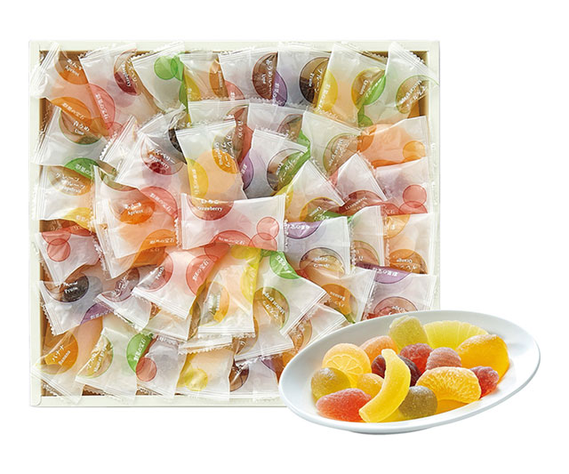 多彩な果実の風味をギュッと詰めた一口サイズのゼリー。一粒一粒がフルーツをかたどった愛らしいカタチは贈られた方の笑顔を誘います。