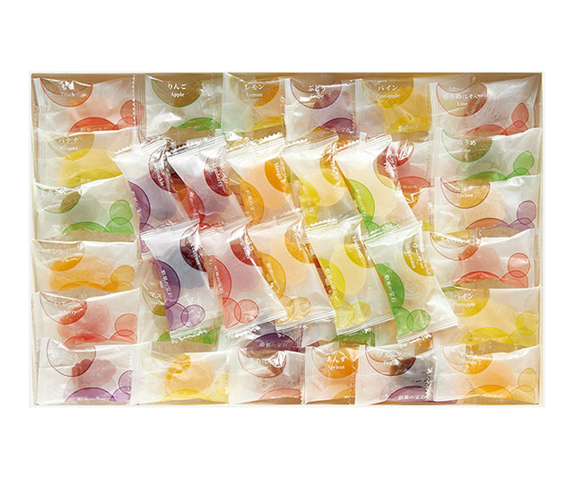 多彩な果実の風味をギュッと詰めた一口サイズのゼリー。一粒一粒がフルーツをかたどった愛らしいカタチは贈られた方の笑顔を誘います。