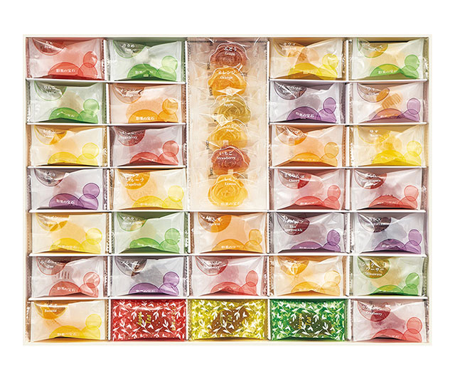 多彩な果実の風味をギュッと詰めた一口サイズのゼリー。一粒一粒がフルーツをかたどった愛らしいカタチは贈られた方の笑顔を誘います。