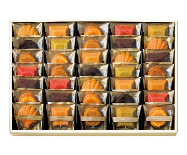 - マドレーヌ・メープルアーモンドケーキ・フィナンシェ・りんごバターケーキ×各5、いちごバターケーキ・フィナンシェショコラ・フィナンシェピスタチオ×各4、チョコオレンジケーキ×3