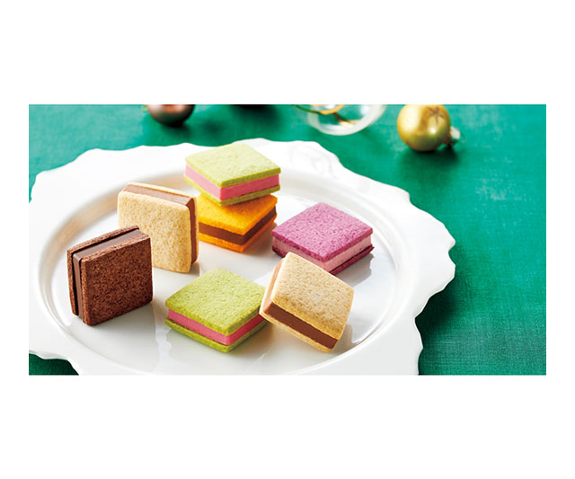 サクッと焼きあげたサブレに、なめらかなチョコレートガナッシュをサンド。カシス&ホワイトチョコレートやピスタチオ&ラズベリー、ミルクチョコレートキャラメルなど、カラフルな5種の詰合せです。