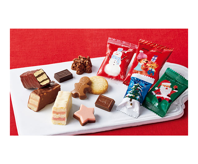 口どけのよいチョコレートやサクッとしたミルフィーユなどを詰め合わせました。サンタやツリーなど可愛らしい限定デザインでお届けします。