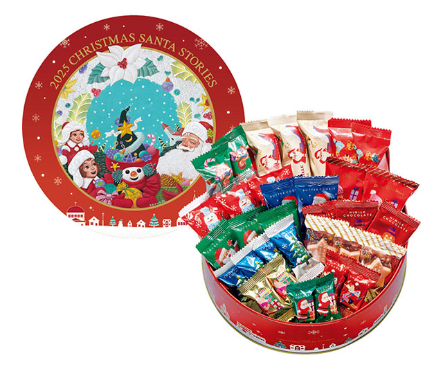 クリスマスミックス(チョコレート菓子、クッキー、マシュマロ)132g、ミルフィーユ(チョコレート×3、アーモンド・ストロベリー×各2)/缶入
