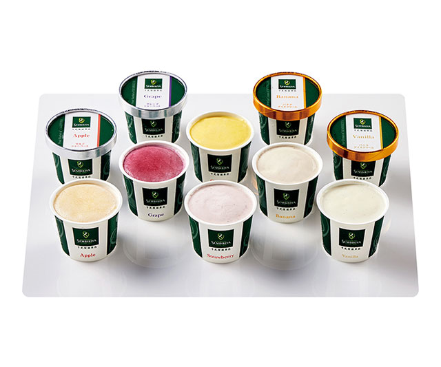 アイスクリーム(バニラ・バナナ×各2、ストロベリー×1)、シャーベット(りんご・グレープ×各2、オレンジ×1)、各120ml
