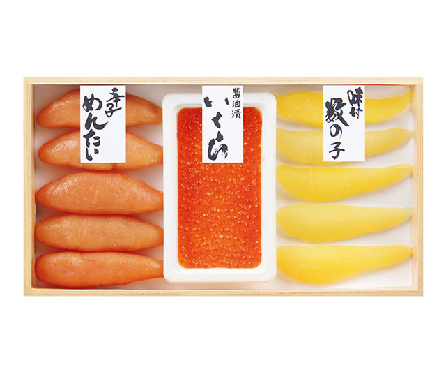 - 無着色辛子明太子160g、北海道産いくら醤油漬60g、味付数の子80g ※明太子・味付数の子は密封袋入