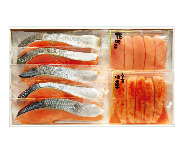 - 紅鮭切身(甘塩味)×2、銀鮭切身(甘塩味)×3、辛子明太子・たら子各150g×各1