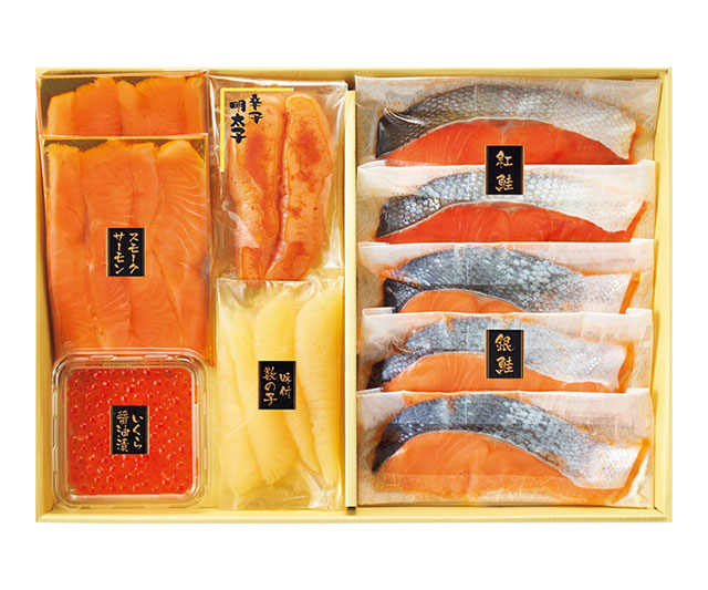 - 銀鮭切身(中塩味)×3、紅鮭切身(甘塩味)・スモークサーモンスライス40g×各2、北海道産いくら醤油漬40g・味付数の子60g・無着色辛子明太子70g×各1