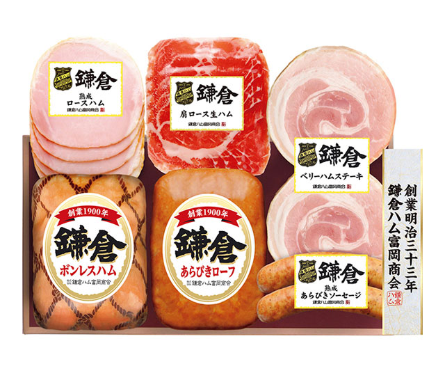 - ボンレスハム・あらびきローフ各160g、熟成ロースハム63g、肩ロース生ハム50g、ベリーハムステーキ100g、熟成あらびきソーセージ80g