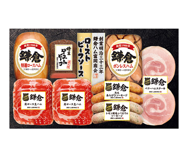 - 特選ロースハム320g・直火焼ローストビーフ110g・ボンレスハム160g・熟成あらびきソーセージ80g・レモン風味とパセリのソーセージ80g・ベリーハムステーキ100g・ローストビーフソース30g×各1、肩ロース生ハム50g×2