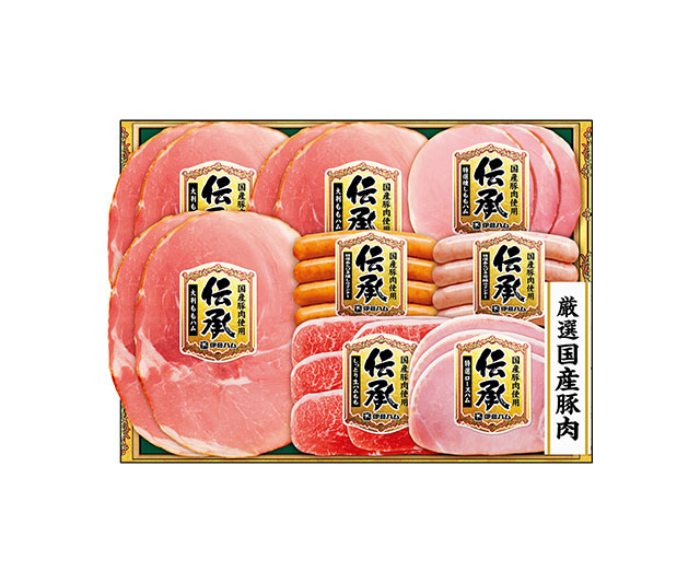 創業以来受け継がれてきた技と思いを結集した〈伊藤ハム 伝承〉。選び抜いた国産豚肉を使用し、素材の旨みを逃さぬよう肉の状態を見極めたうえで調味液に漬け、丁寧に加熱。美味しさを引き出すため、各工程では細心の注意を払いながら、贈り物にふさわしい味わいに仕上げています。便利な少量パックや大判のハムなどもセットにした、バラエティー感やボリュームにもこだわった贈り物です。