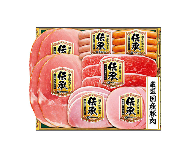 創業以来受け継がれてきた技と思いを結集した〈伊藤ハム 伝承〉。選び抜いた国産豚肉を使用し、素材の旨みを逃さぬよう肉の状態を見極めたうえで調味液に漬け、丁寧に加熱。美味しさを引き出すため、各工程では細心の注意を払いながら、贈り物にふさわしい味わいに仕上げています。便利な少量パックや大判のハムなどもセットにした、バラエティー感やボリュームにもこだわった贈り物です。