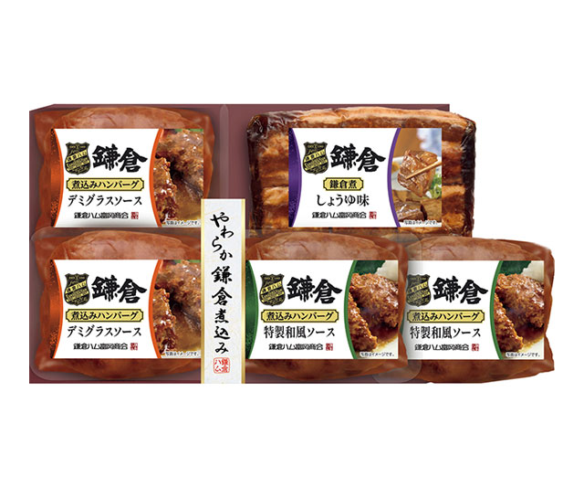 - 鎌倉煮込みハンバーグ(デミグラスソース・特製和風ソース各120g×各2)、鎌倉豚角煮しょうゆ味120g×1