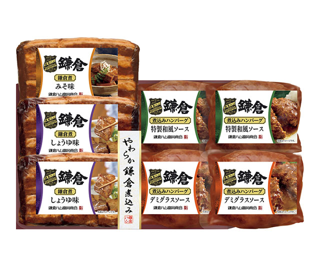 - 鎌倉煮込みハンバーグ(デミグラスソース・特製和風ソース各120g×各2)、鎌倉豚角煮(しょうゆ味×2、みそ味×1、各120g)